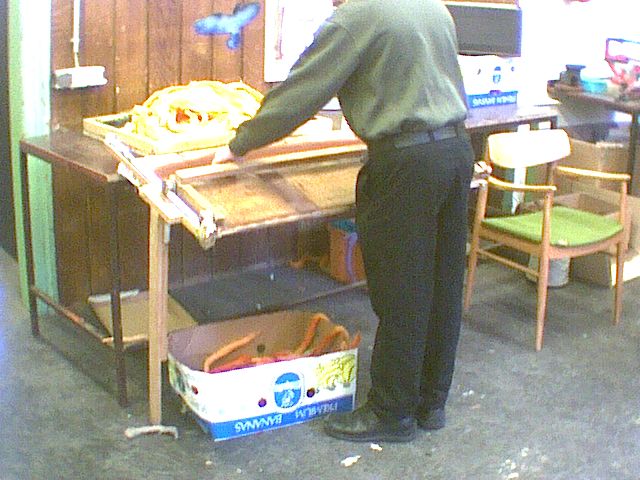 "Nitscheln" Herstellung der Schafwoll-Lunten welche später verwebt werden.